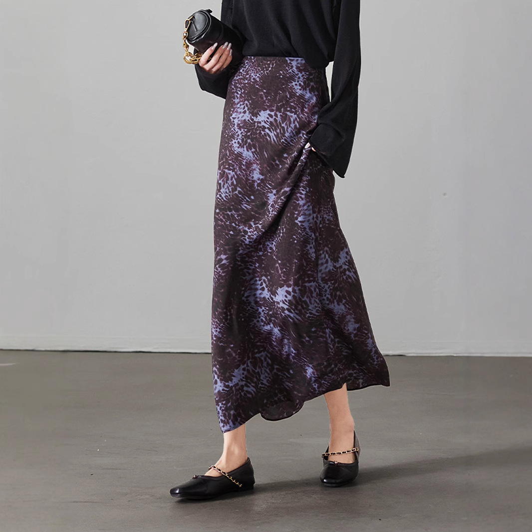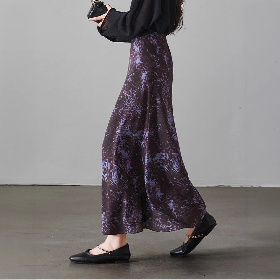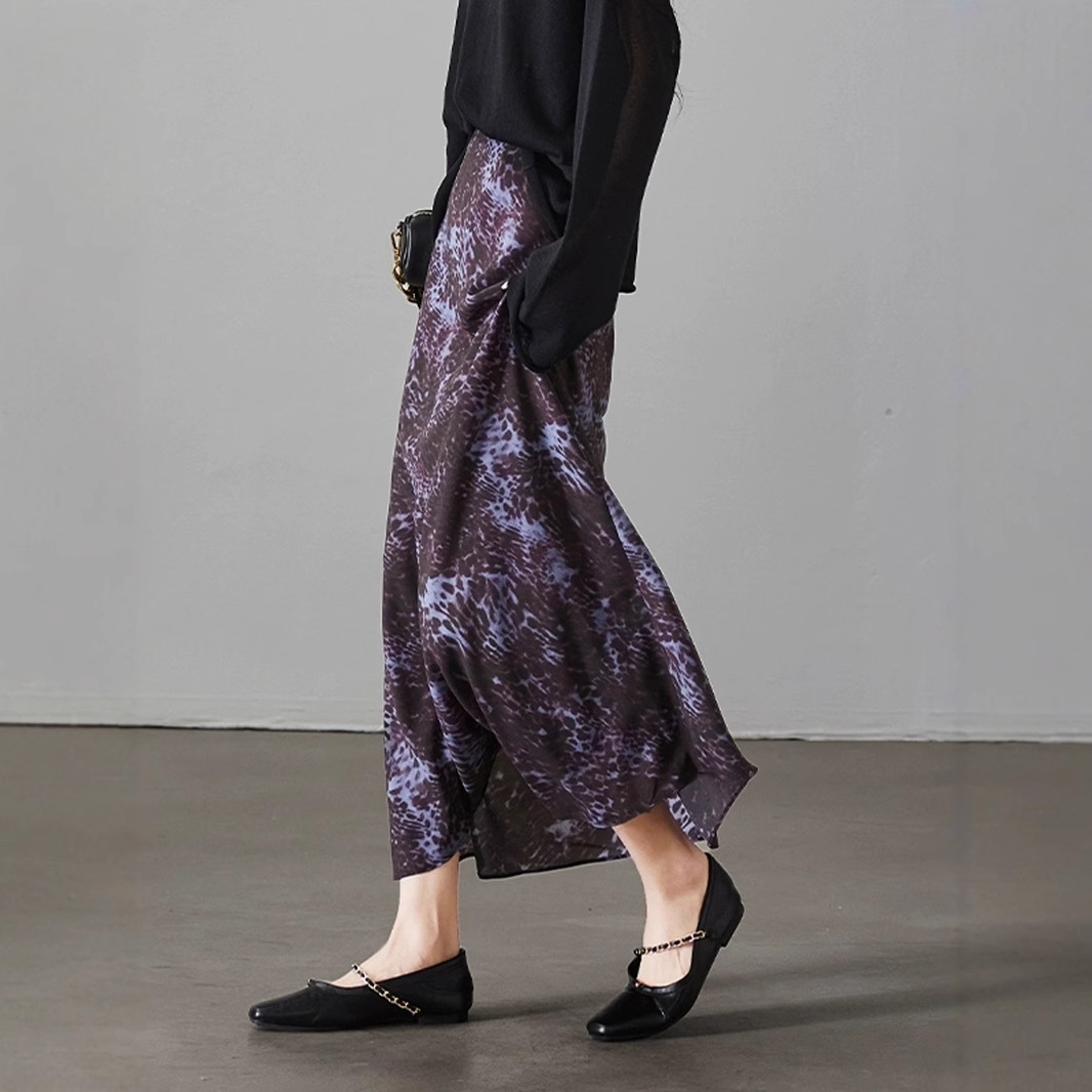 艶やかな光沢感のある生地にアニマル柄をあしらったフレアスカートです。