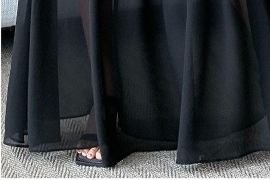 シースルー素材が優雅に揺れ動き、歩くたびに女性らしさを演出します。