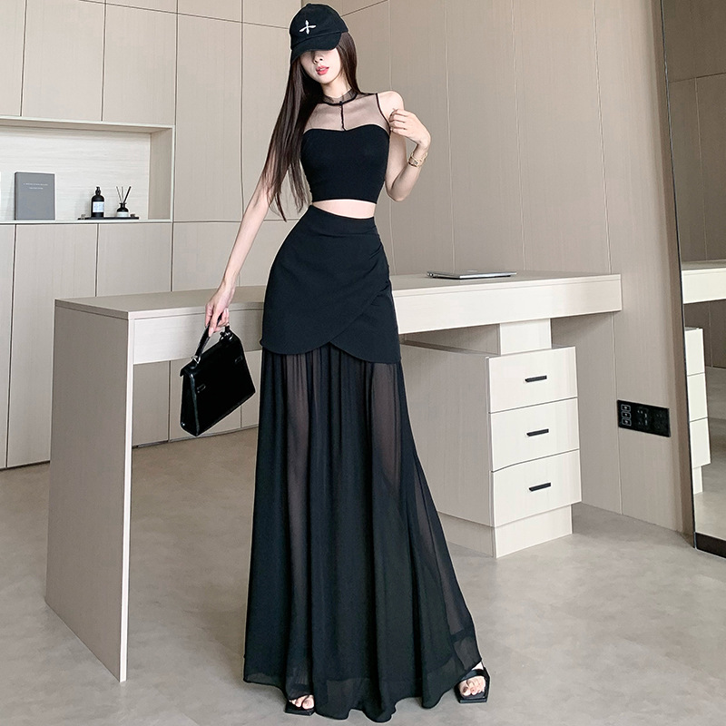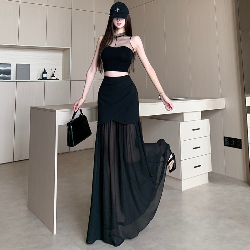 上部の無地生地と裾部分の透け感のある軽やかな素材を組み合わせた、マキシ・ロング丈のレイヤードスタイルが特徴的です。