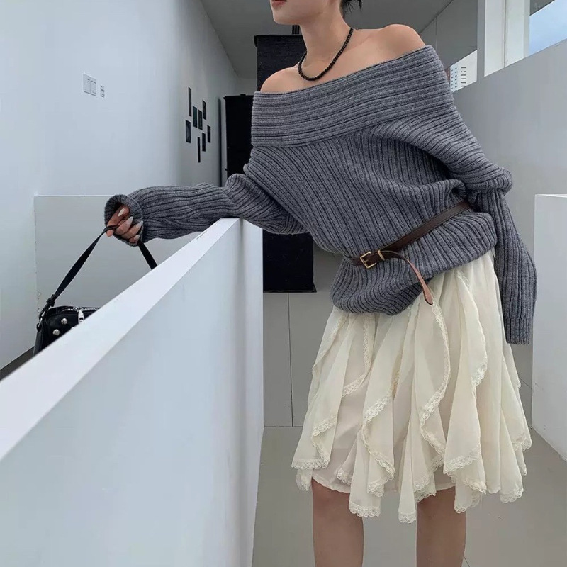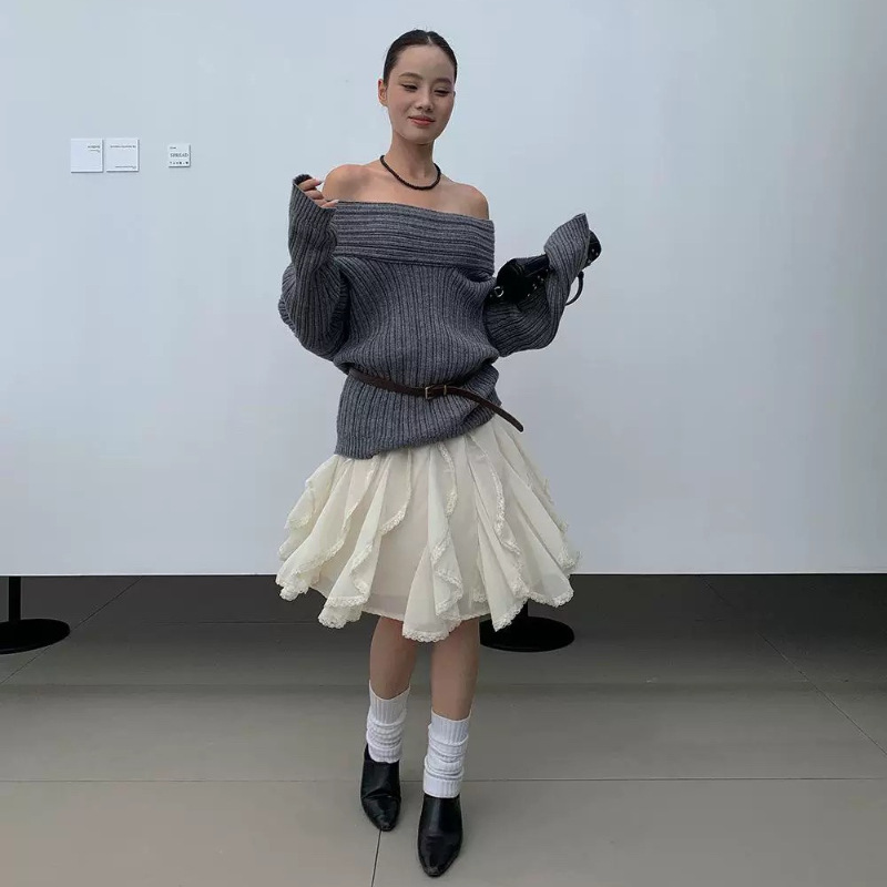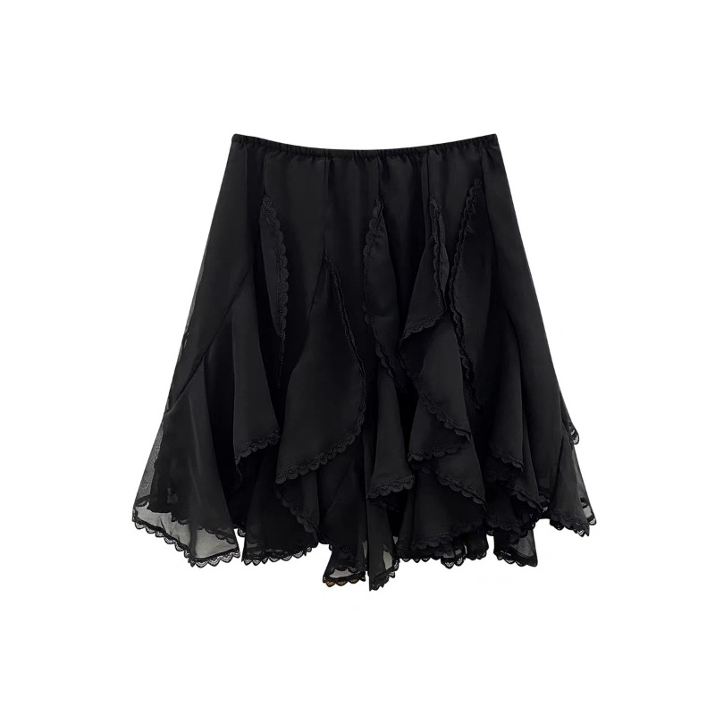 裾に繊細なレース装飾を施した上品なフレアスカートです。ひざ・ミドル丈で女性らしいシルエットを演出します。