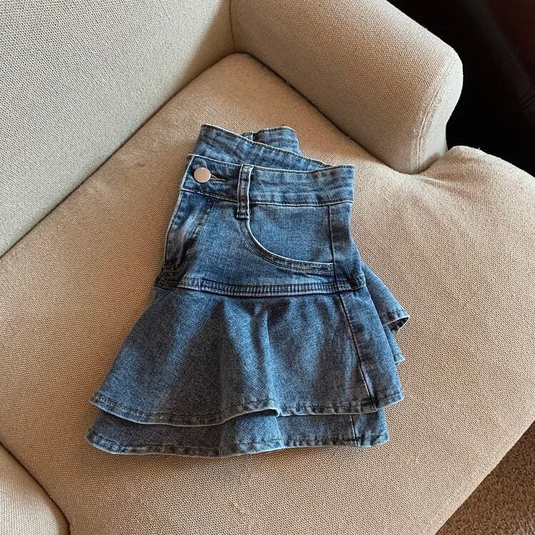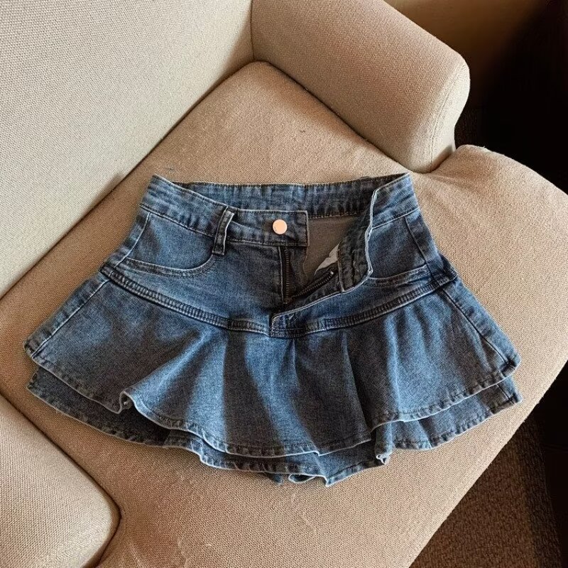 デニム生地を使用したカジュアルなミニ・ショート丈のフレアスカートデザインです。