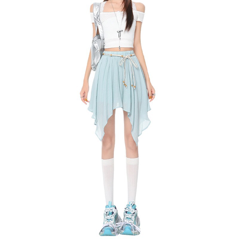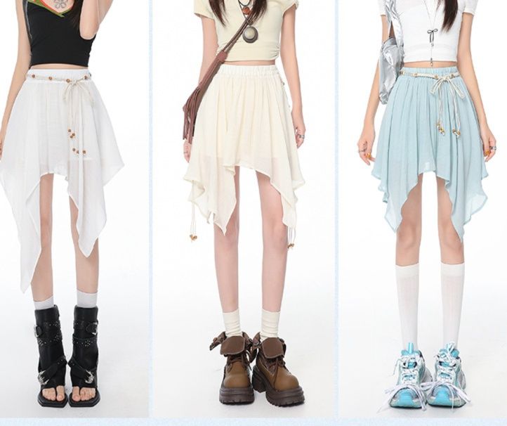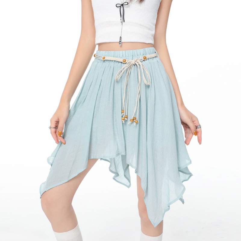 ミニ・ショート丈で脚長効果も抜群。ウエストには編み上げ紐と木製ビーズをあしらった装飾ベルトが付いており、調節可能で着こなしの幅が広がります。